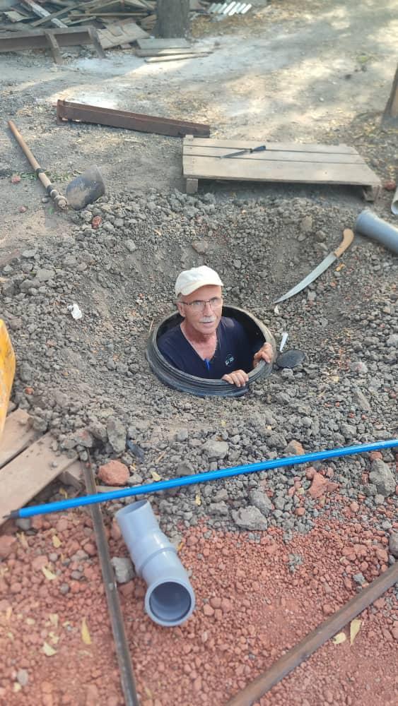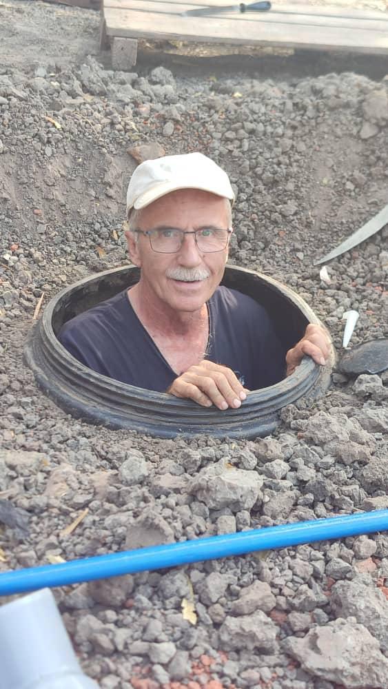 Bruder Hans überprüft gerade den frisch gebauten Wassertank.