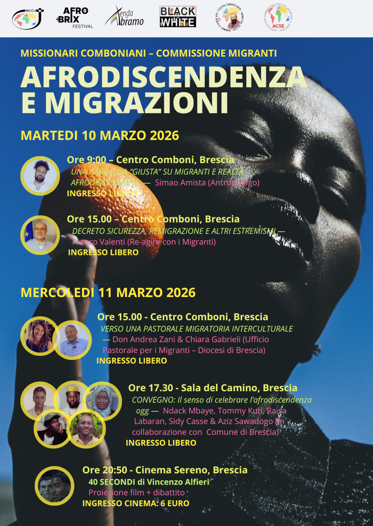 Il programma prende avvio martedì 10 marzo al Centro Comboni, con due sessioni aperte al pubblico. Alle 9.00 l’antropologo Simão Amista — studioso di religioni e filosofie africane e afrodiscendenti di origine italo-afro-brasiliana — conduce l’incontro “Per una narrativa giusta su migranti e realtà afrodiscendente”. Nel pomeriggio, alle 15.00, Franco Valenti di Re-agire con i Migranti, esperto di sociologia urbana e membro del gruppo europeo CLIP, affronta il tema “Decreto sicurezza, remigrazione e altri estremismi”.