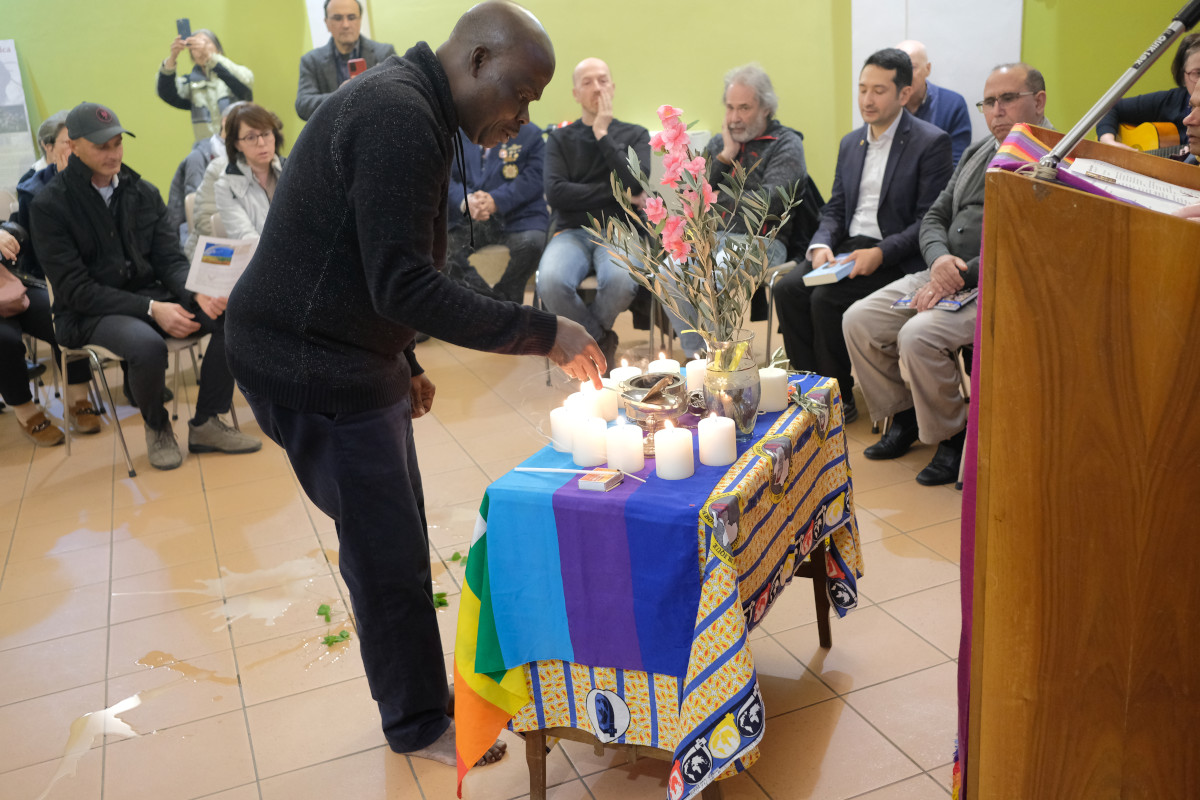 Dopo il canto del Padre nostro, che è diventato la preghiera comune per tutti, la libazione gli antenati, propria della Religione Tradizionale Africana della Costa degli schiavi, prima con bevanda alcolica poi con farina sciolta nell’acqua ed infine con l’acqua arricchita dalla potenza delle erbe, a cui ha fatto seguito il canto della pace, nella preghiera Semplice di Francesco.